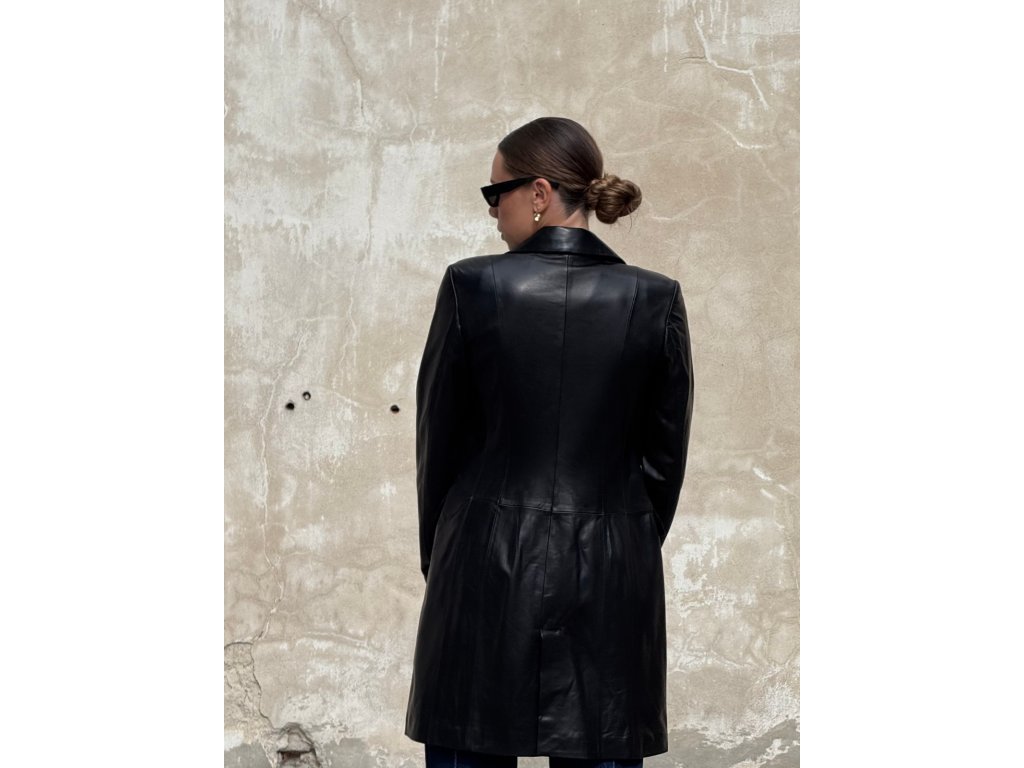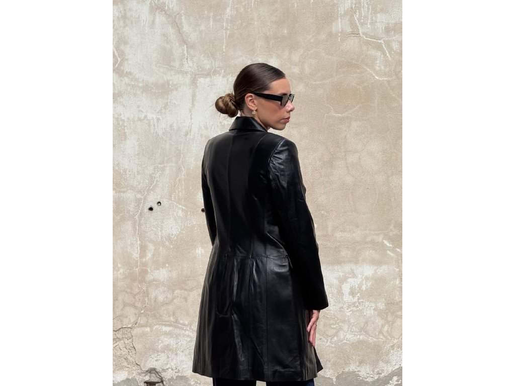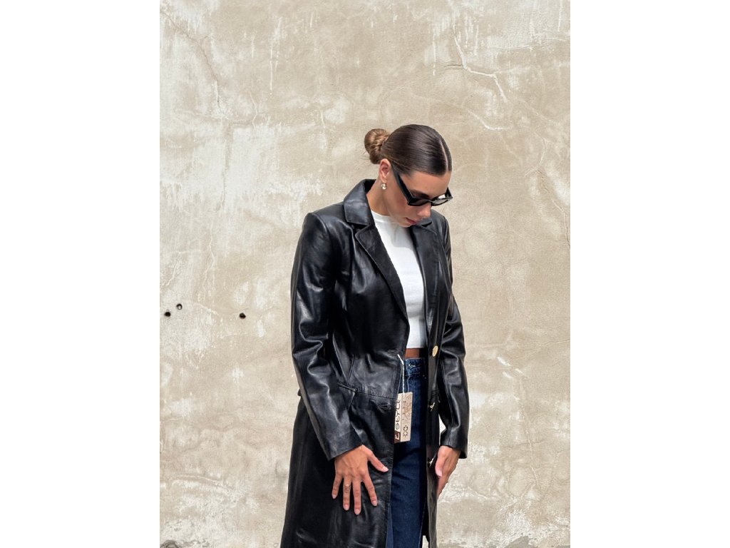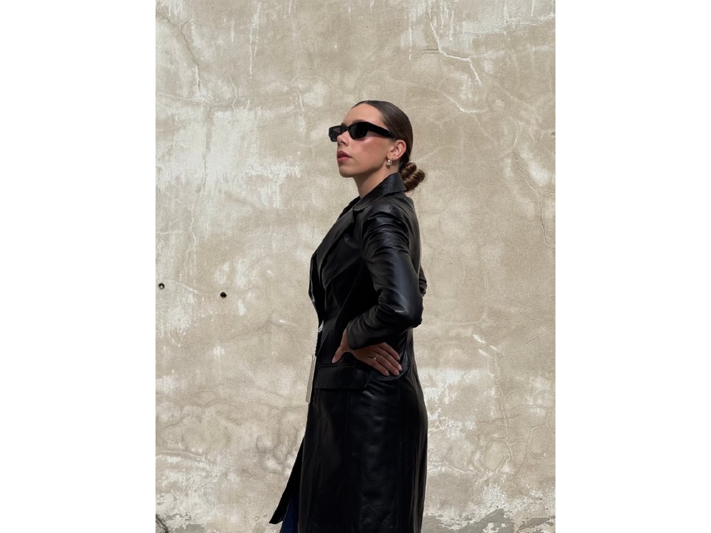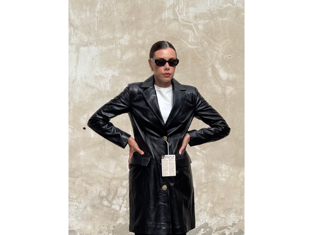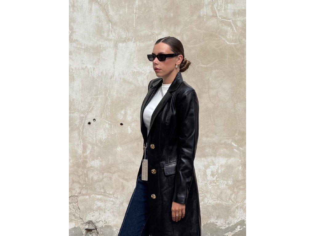 ADÉLA – Čierny Dámsky Kožený Plášť so Zlatými Gombíkmi (jar/jeseň) | KSTYLE