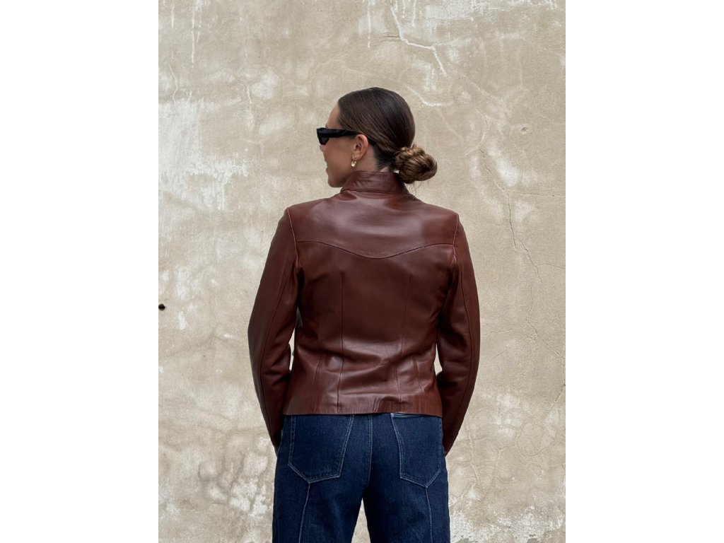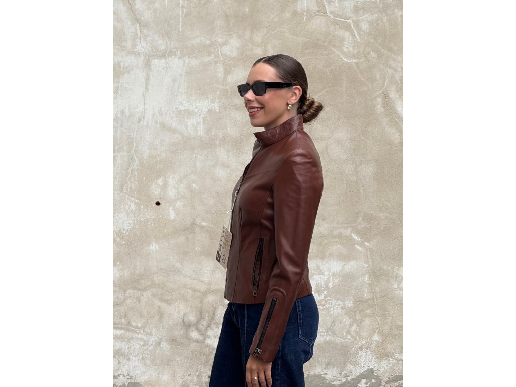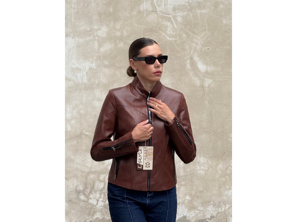 Dámska bunda ALINA z pravej jahňacej kože v hnedej alebo čiernej farbe. Elegantný strih, zapínanie na zips, ideálna na jar a jeseň.