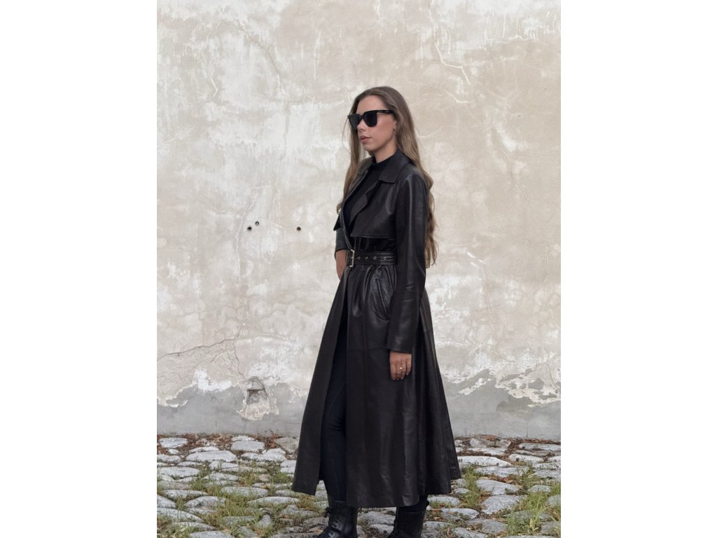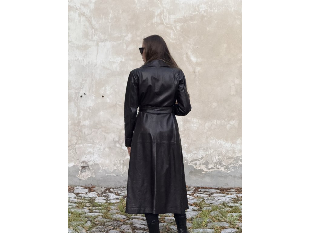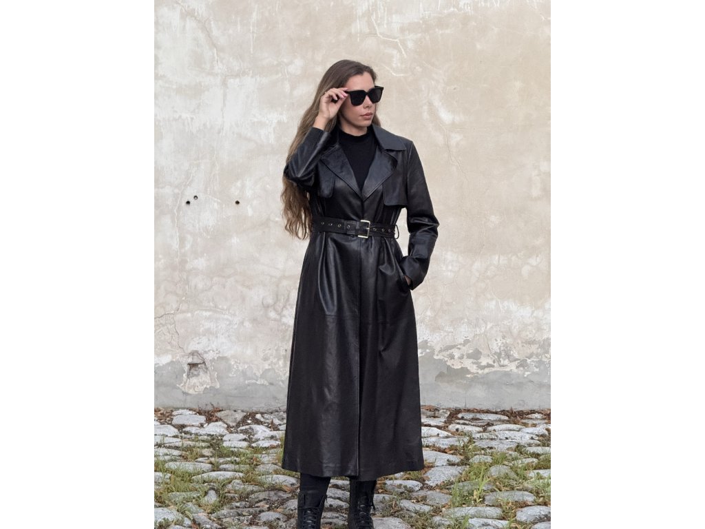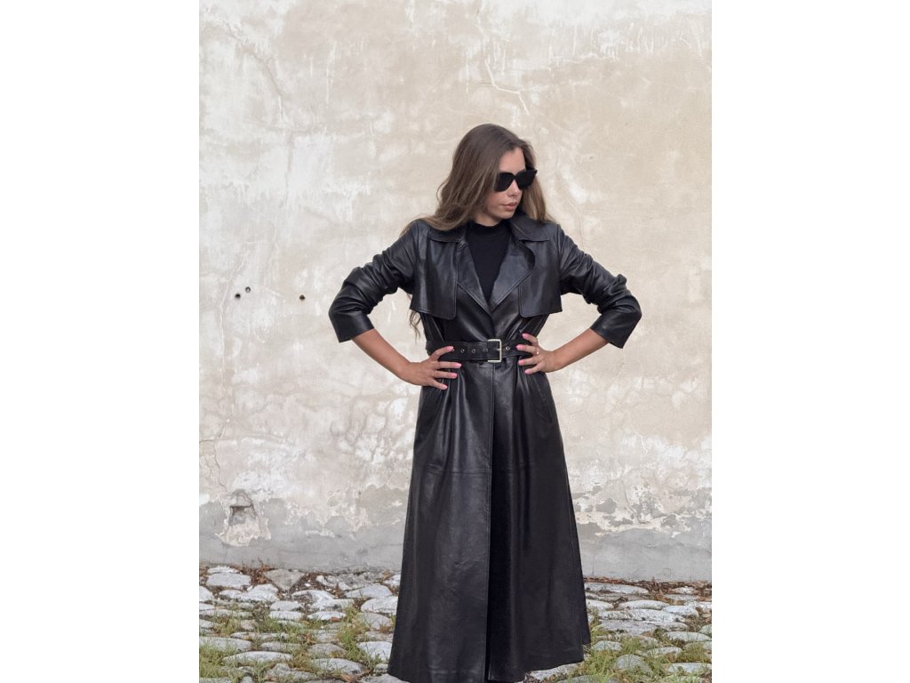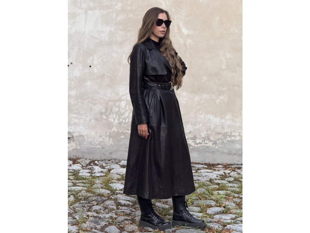 Plášť MILENA z prémiovej jahňacej kože spája nadčasovú eleganciu a pohodlie. Skrytý zips a opasok zvýraznia pás, moderný strih lichotí postave a čierna klasika zaručí luxusný vzhľad na denné aj večerné príležitosti.